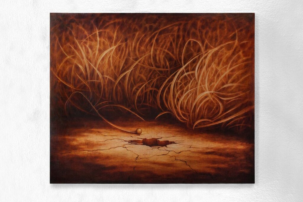 This suspension of the ‘real’ can be seen in Wish or Apocalypse?, where a meteor is stopped in its descent. The title, along with the imagery, asks the viewer to interpret the situation: to decide if it is salvation or doom, if it will come to hit you or pass you by, if it is a climate disaster or divine intervention. A similar lack of certitude is brought by Time Stand Still, a title which simultaneously functions both as a command and a desire for a painting where an hourglass unnaturally balances, on the verge of tipping over and breaking, or miraculously falling over and halting time. The sky, a place where time is seen, remains in a dark purgatory, unrevealing.