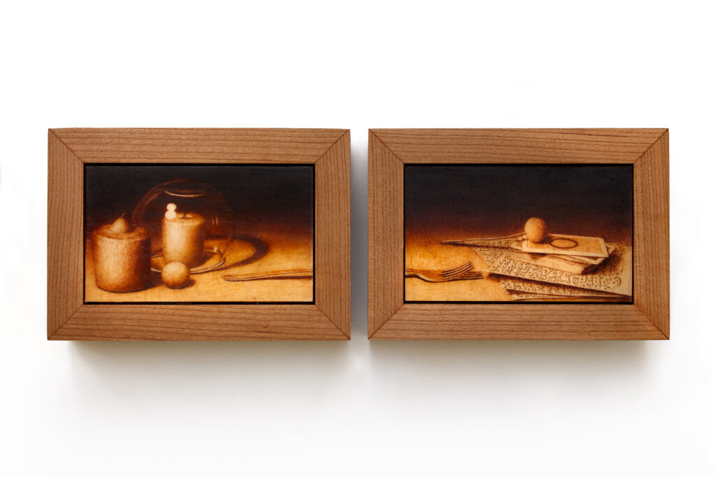 If one perseveres to sit with each piece, he or she will intuit the language of these works and in turn read their signs. The ‘characters’ of this world mirror us and our bodies. Logical Thinking separates the body by isolating the head. Narcissus distracts from its overflowing hoarded resources with its beautiful reflections. I’m here! claims to know itself when it cannot see its own reflection clearly. Choose demands you to consume either fallen humanity or death, while Option #1 and Option #2 serves you another binary: certain separation or ambiguous wisdom. Each of these paintings present a curated still life meant to challenge one’s perception. It is only in Hope, a looser scene, with movement in the water and the only lit candle, that one will find a true sharing of abundance, a light in the darkness. It brings you out of theatrics, out of desperation and bewilderment, and back into the most important question: what will be our future?