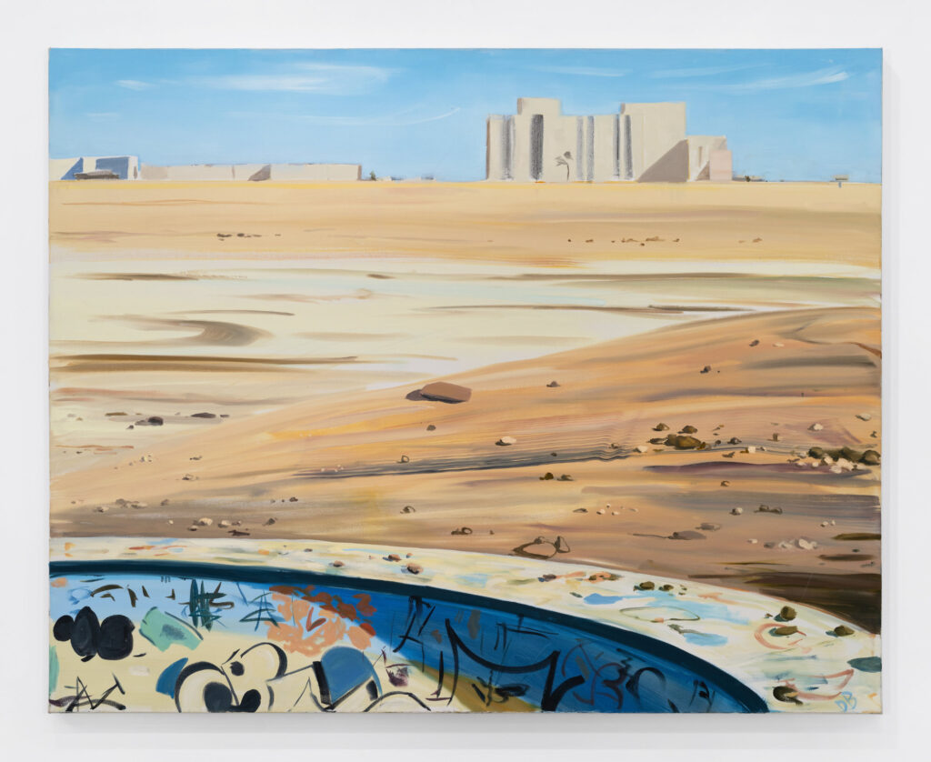 Barnes found early inspiration in the L.A. Dogtown Z-Boys culture, the young skateboarders who transformed their surroundings, repurposing Venice California’s ruined urban landscape after the economic stresses and drought of the ’70s. Abandoned homes and empty backyard pools became sites of reinvention, where destruction itself became a medium for renewal. Barnes captures the era’s utopian impulse—a reclamation of the discarded and forsaken—with an unmistakable optimism. His paintings of dry, graffiti-covered pools and of contemporary skate parks modeled after them show us the vestigial reimagined. And they anticipate his ongoing fixation on the arid landscape and all its current implications.