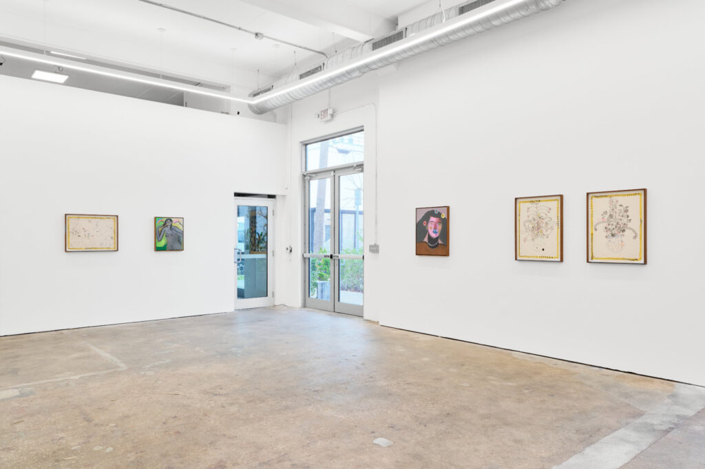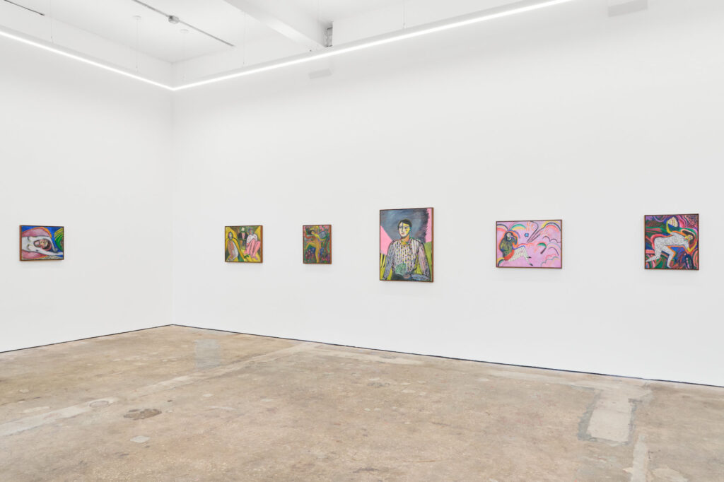 In El Gran Somriure de la Dona Gris, the viewer’s attention is immediately drawn to the central gray, almost sculptural, female figure. Small rosy circles accentuate her cheeks, while a constellation of star shapes traces her collarbone, resembling jewelry. Her expression exemplifies a quality central to Subidé’s portraiture: knowing, slightly amused, neither fully accessible nor entirely withheld. The highlighter-green outline defining her torso introduces a graphic tension, suggesting the figure could dissolve into pure color at any moment. Subidé avoids psychological resolution, instead presenting a figure who smiles yet retains her secrets.