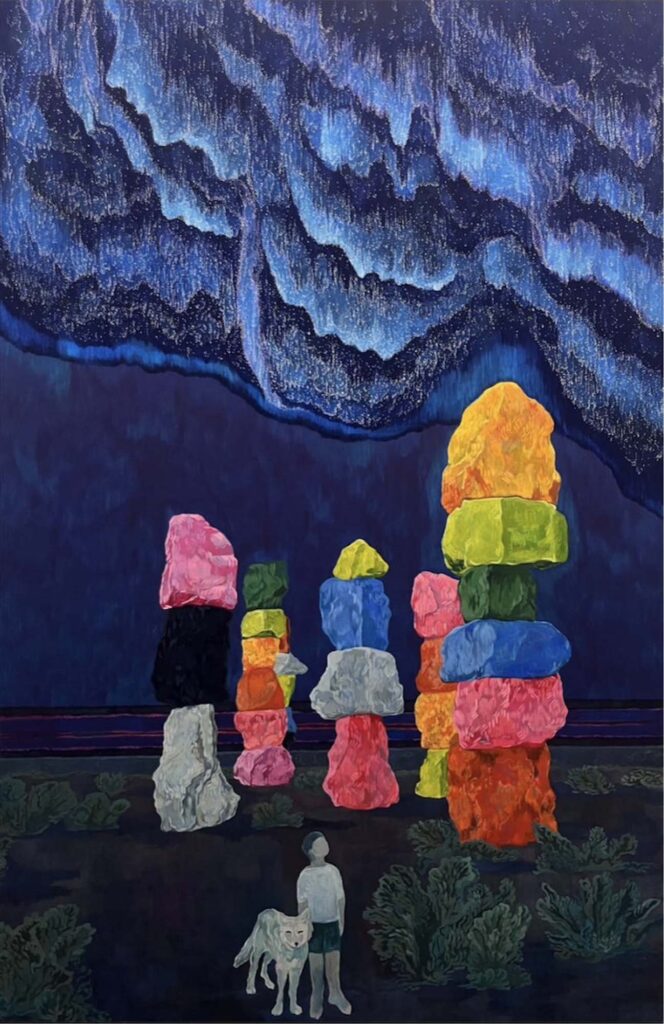 Her practice centers on painting, developing immersive, dreamlike environments in which landscapes become psychological spaces and figures appear suspended between memory, passage, and transformation. Drawing on personal mythology and a visual language shaped by cinema and contemporary screen culture, Dumon creates images marked by symbolic clarity, quiet intensity, and poetic restraint.