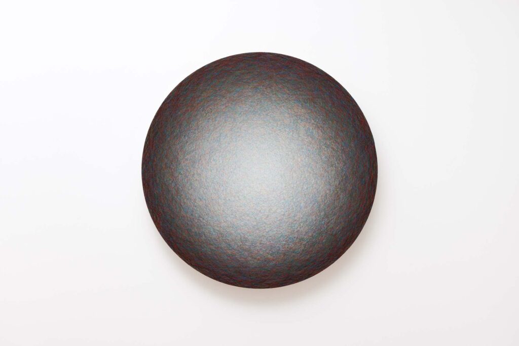 Lukas refers to the surface at the back of each of these objects as a “reflector,” a pseudo-mirror that causes ambient light rays to bounce back aggressively through the mesh of thread into space, where it meets the viewer’s eyes. With time and focus, where the density of the mesh thins out around the center of each composition, a sphere-like form emerges, hovering in front or behind the object like an intangible, ethereal presence. Whereas most painters are concerned with light and lighting insofar as they can be used to enhance the painting’s surface, or at least prevent distraction from what is rendered on this surface, for Lukas, light itself plays the starring role.